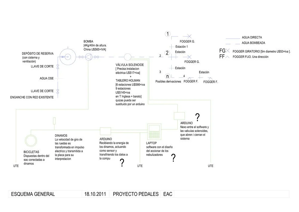 Pedales adjudica a cada acción una o más reacciones de la instalación de forma aleatorea, la interfase permite canalizar las energías, dirigirlas y activar las reacciones. De esta forma la instalación modifica el paisaje siempre en forma diferente.