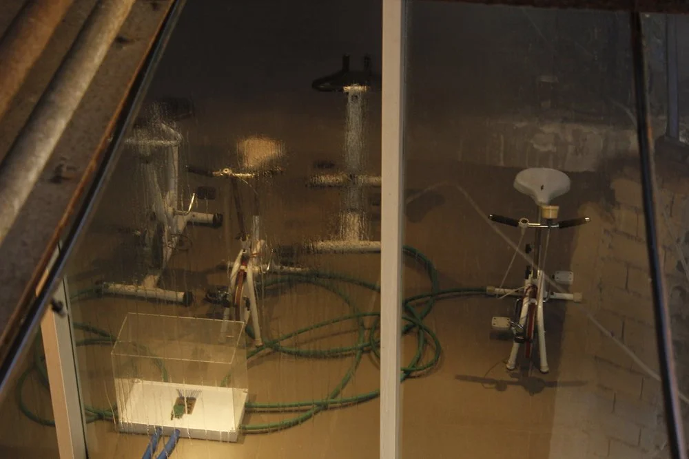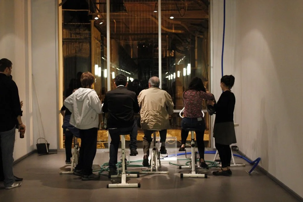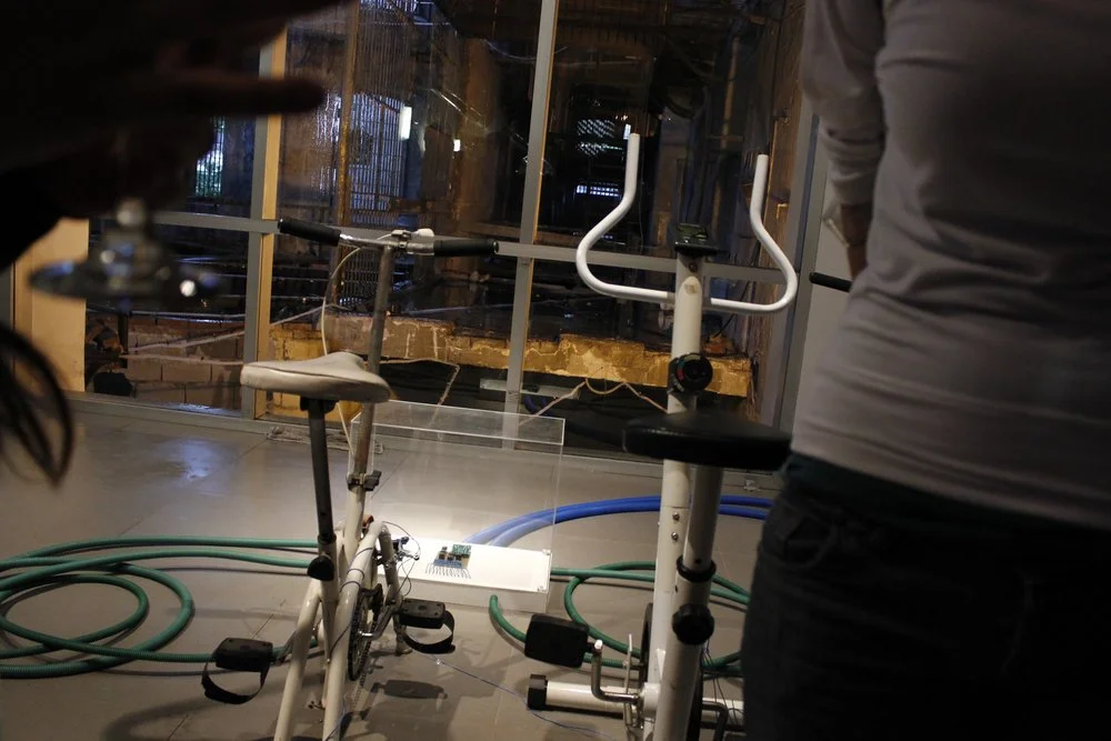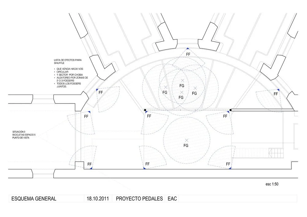Pedales recoge energías individuales, para decodificar acciones concretas de los visitantes en informaciones energéticas, estas generarán la obra, en un ciclo en donde cada individuo será parte del resultado total.